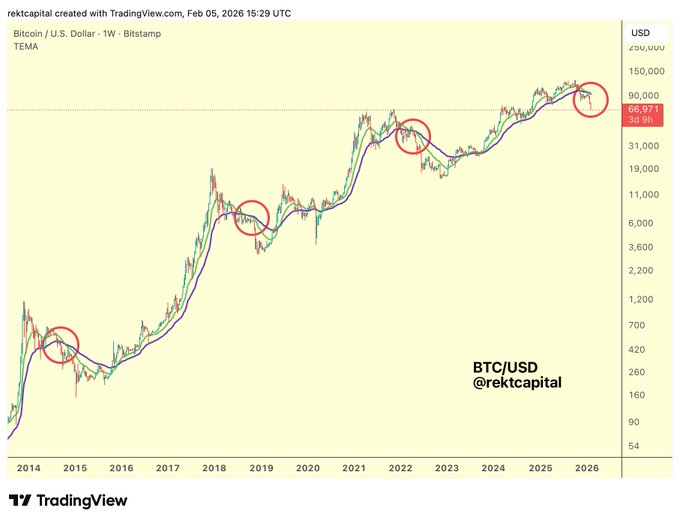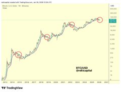 #BTC It's official This is now the 4th consecutive cycle where the crossover of the Bull Market EMAs has preceded macro downside continuation $BTC #Crypto #Bitcoin twitter.com/rektcapital/status...