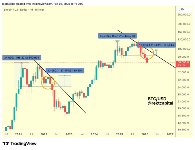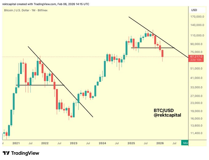 #BTC Whenever Bitcoin peaks in its Bull Market in Q4 of the Post-Halving year... It tends to produce a multi-month Relief Rally from the Macro Triangle Base before breaking down from the Triangle to transition into Bearish Acceleration This is the 4th consecutive cycle that this historical tendency has continued And history suggests there's more downside to come $BTC #Crypto #Bitcoin twitter.com/rektcapital/status...